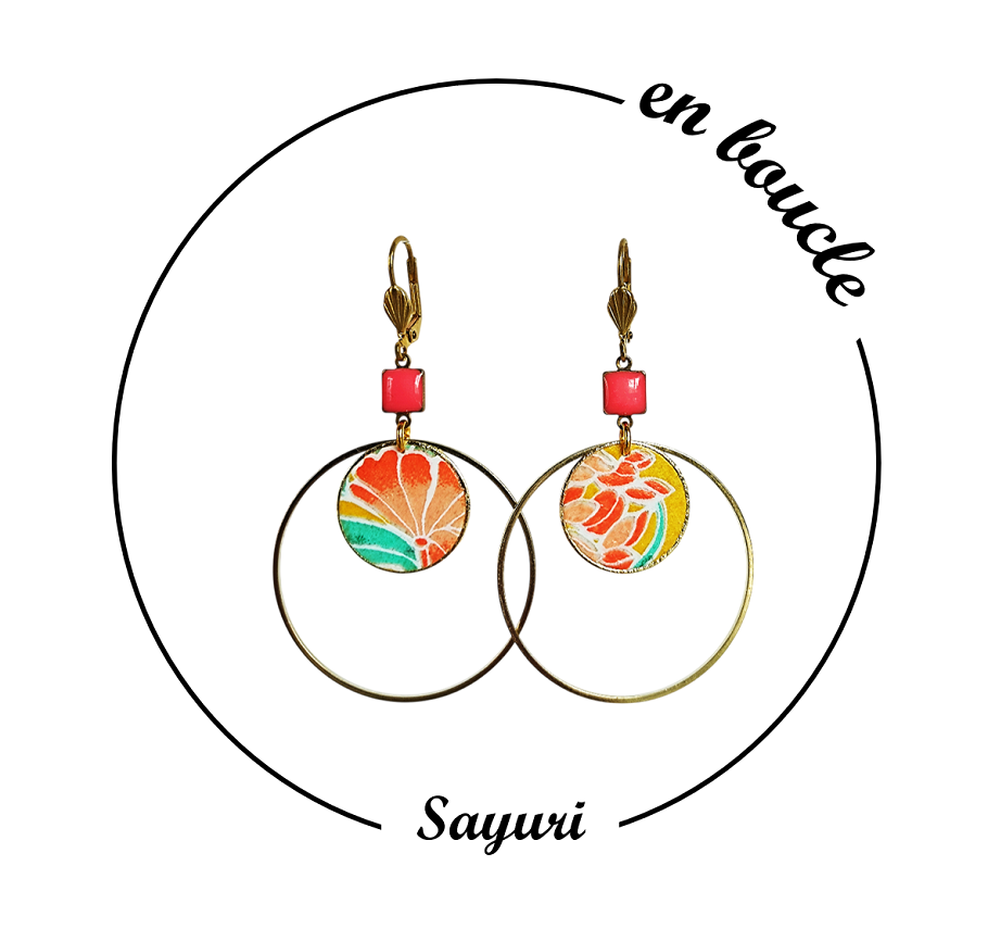 Cette paire de boucles a le don d’effacer les cernes et les marques de tracas (quels tracas ? exactement – ça fonctionne !!), on les a fait macérer plusieurs jours dans un mélange de bonne humeur (une cuve est à votre disposition à l’atelier – pour les urgences !). On adoooore son motif fleuri orangé et sa forme ronde xxl, tellement gourmande !
